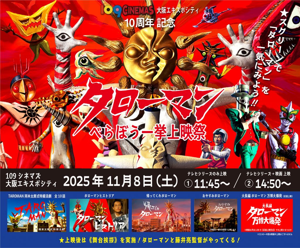 109シネマズ大阪エキスポシティ の10周年記念として、テレビシリーズの『タローマン』作品+映画を一挙上映する特別上映イベントが2025年11月8日に急遽開催決定!