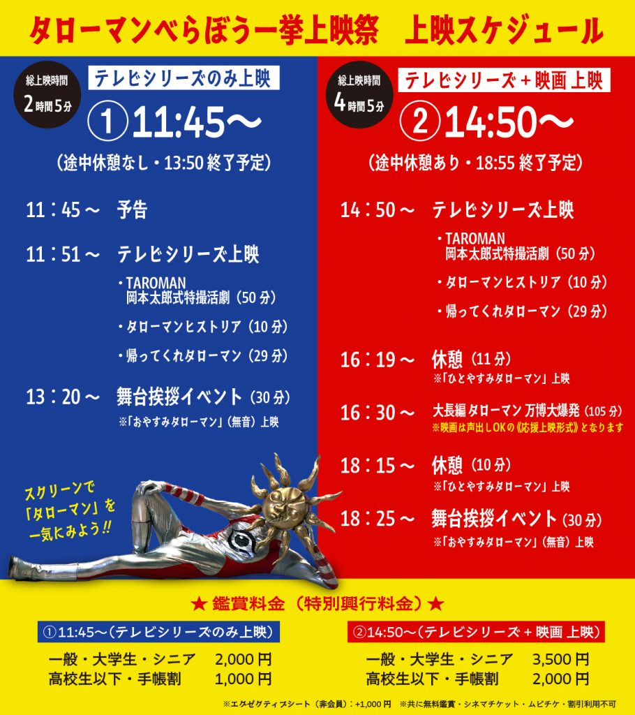 テレビシリーズの「TAROMAN 岡本太郎式特撮活劇」(全10話)、「タローマンヒストリア」、「帰ってくれタローマン」、「おやすみタローマン」と映画「大長編 タローマン 万博大爆発」のすべてを一挙放送する、総上映時間4時間超のべらぼうなイベントです。