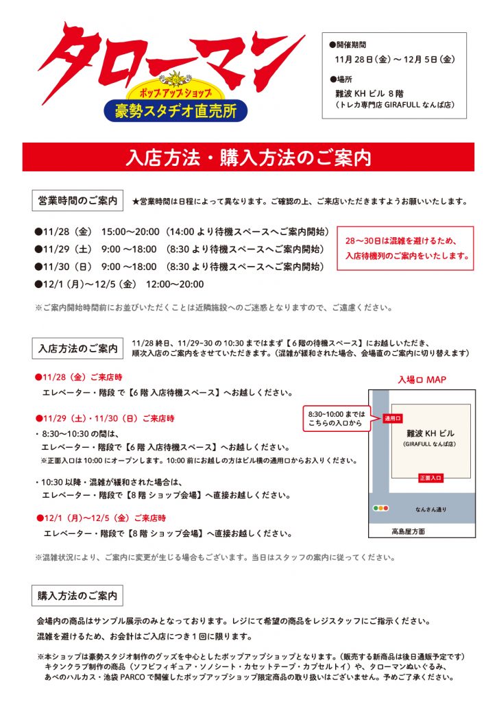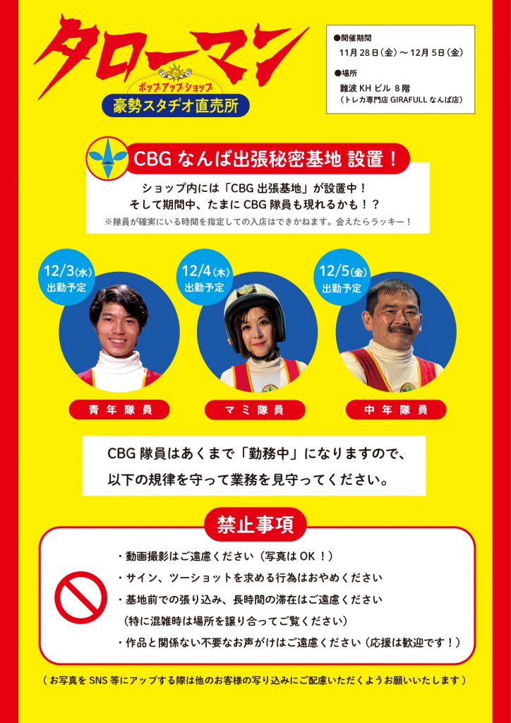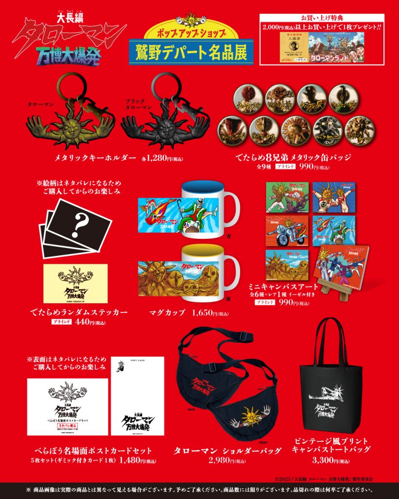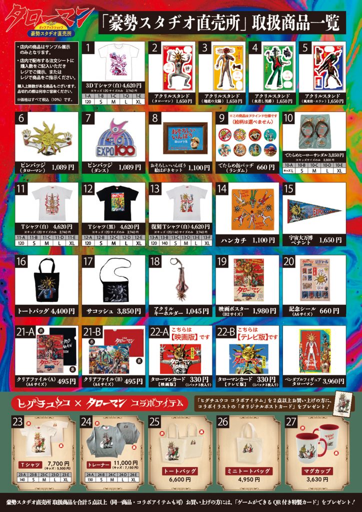 (上映内容) ◎テレビシリーズ 「TAROMAN 岡本太郎式特撮活劇」(全10話) 「タローマンヒストリア」 「帰ってくれタローマン」 「おやすみタローマン」※舞台挨拶中に映像の一部を無音で上映 「ひとやすみタローマン」※休憩時間に映像の一部を上映 ◎映画「大長編 タローマン 万博大爆発」(発声OKの応援上映形式で上映)
